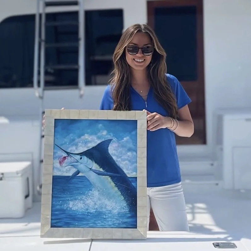 The Carolina Ladies Billfish Classic is a premier fishing tournament dedicated to women in the sport of fishing, with proceeds benefiting Share Our Suzy, a nonprofit organization that provides support to women fighting breast cancer. Bryn contributed to this meaningful event by assisting the launch and donating two original artworks to auction. Her first piece, Leap of Faith, represents courage and resilience, while her second piece, Saltwater Cowgirl, was created live on the final day of the tournament, capturing the strength and determination of women in the fishing community.