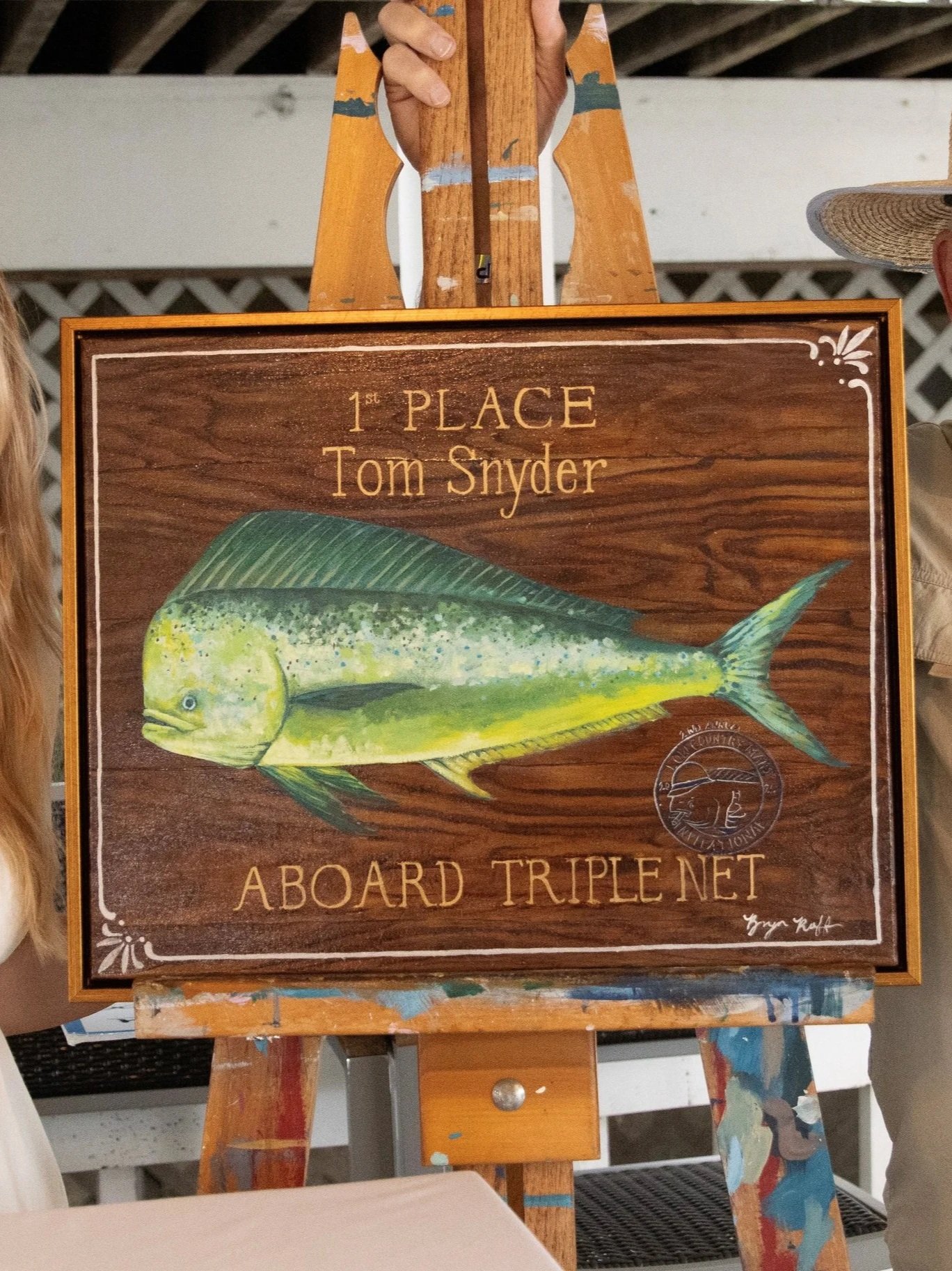 Another standout in Bryn Roff’s faux teak series was awarded to the 1st place angler in the local, Lowcountry Mahi Invitational. Featuring her signature faux teak background, a vibrant mahi, and custom hand-painted gold lettering showcasing the winning angler and boat.