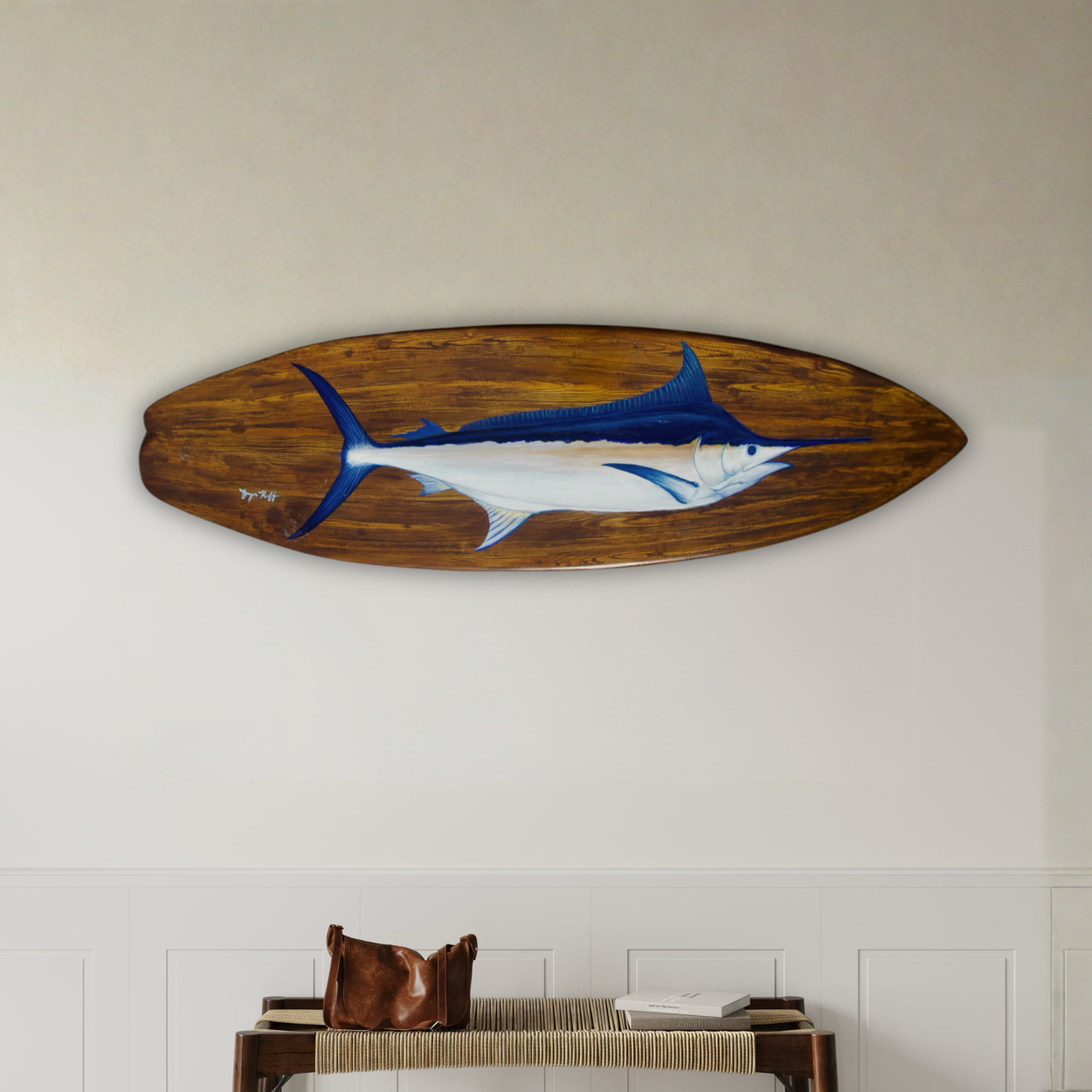 Bryn Roff’s faux teak surfboard, debuted at the HMY Lowcountry Cup Tournament, auctioned to support Captains for Clean Water. Inspired by a Tarpon surfboard she previously painted and gifted to her brother, Wyatt Roff, Bryn added her signature touch with a hand-painted faux teak finish and striking Blue Marlin artwork for HMY. The piece quickly gained popularity and helped spark a new wave of interest in her marine life art work.